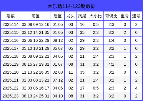 龙头分析:龙头最近10期中,有7期出当前05及以下,3期出当前05以上,上期龙头开出08。本期参考:04。 凤尾分析:凤尾最近10期中,有4期出当前28及以下,6期出当前28以上,上期凤尾开出31。本期参考:24。 大小分析:上期大小比为3:2,最近10期大小比为18:32,合座少许出现频次较高,本期推选大小比为2:3。上期开出大数3枚24、25、31、少许2枚08、13。本期参考大数:20、24、少许:04、07、13。 奇偶分析:上期开罕见偶比3:2,近10期中奇偶比为26:24,其中奇数出现频次较高。本期参考奇偶比为:2:3,参考偶数为04、20、24。 重号分析:上期未开出重号,近10期有6期开出重号,本期看好重号开出13,24。 连号分析:上期开出连号24,25,近10期中有5期出现连号。本期不看好连号开出。 后区走势分析:最近7期后区号码分裂开出05、07,04、05,01、07,02、08,07、12,04、05,04、10,其中【小大】组合的后区出现概率最高,上期开出【小大】组合后区04、10,本期后区参考号码:09、12,属于【大大】步地。 体彩大乐透本期推选: 15+5大复式参考:03,04,05,07,13,16,17,18,20,21,23,24,29,30,34+01,05,07,09,12 9+3小复式参考:03,04,05,07,13,20,24,29,30+07,09,12 5+2单挑一注推选:04,07,13,20,24+09,12 [扫码下载app山东阳谷新日辉电缆有限公司,中过数字彩1千万以上的大众王人在这儿!]