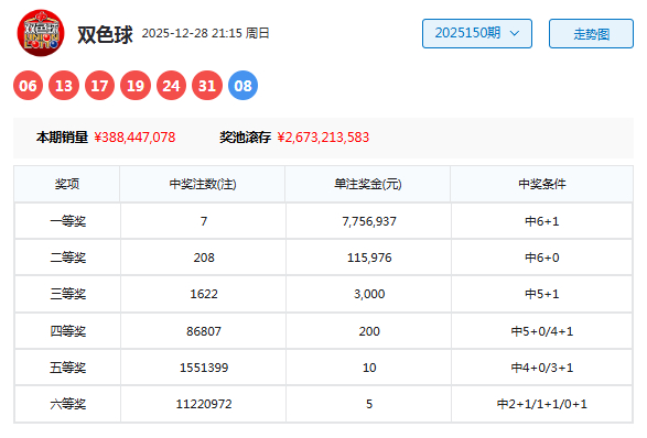 双色球25150期开奖,本期奖号红球06 13 17 19 24 31,蓝球08。当期红球号码大小比为4:2,三区比为1:3:2山东阳谷新日辉电缆有限公司,奇偶比为4:2。方法方面,红球开出1枚重号06。蓝球开出遗漏2期的偶数号码08。